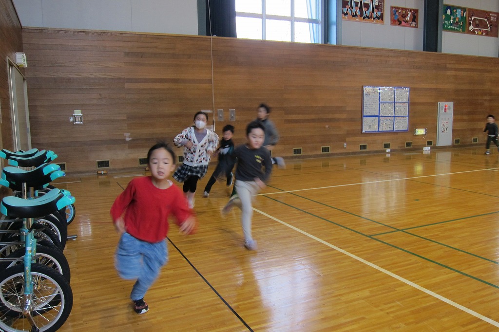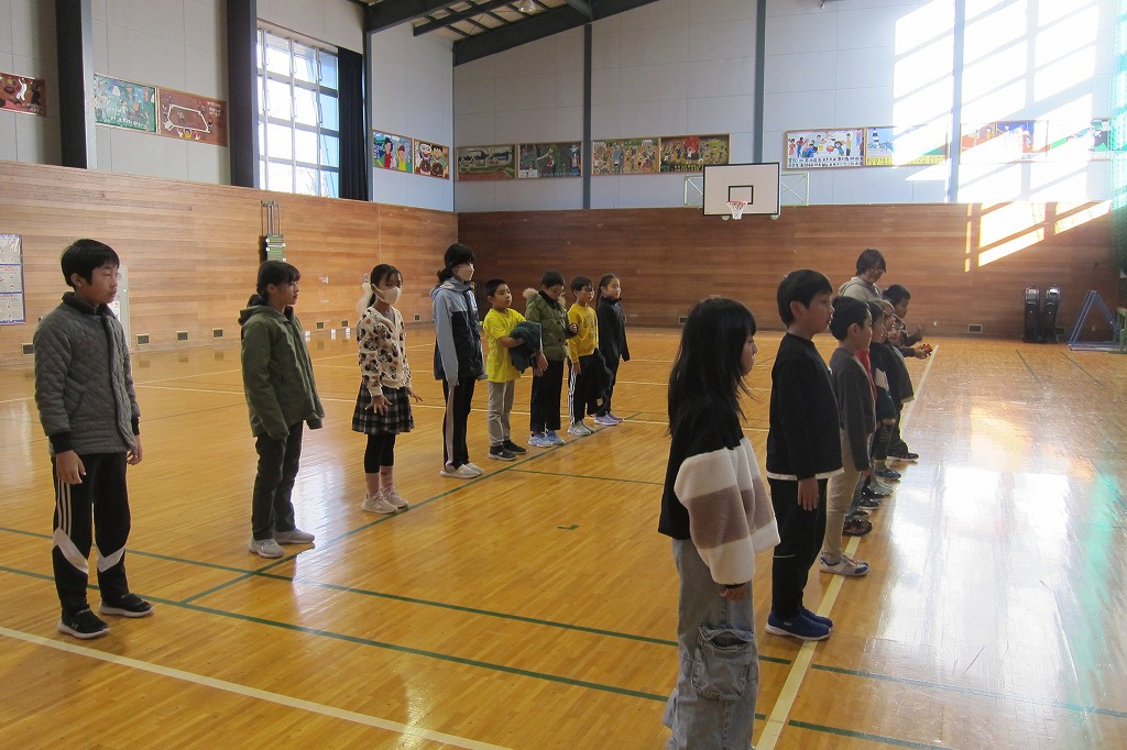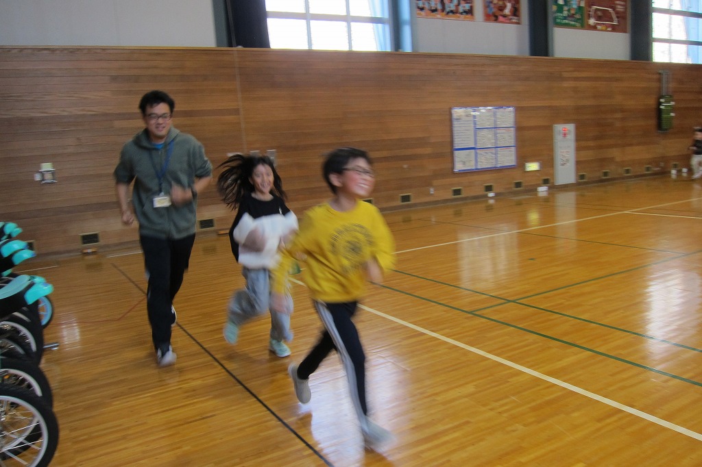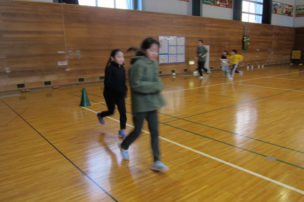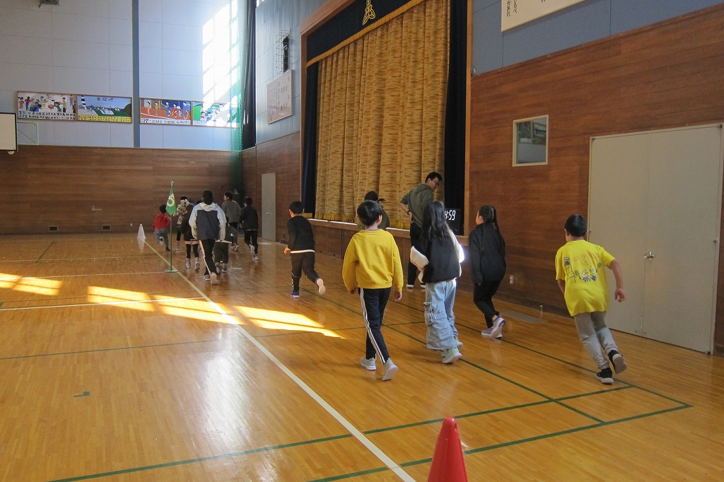 中休みに体育館で最後のマラソン練習を行いました。
