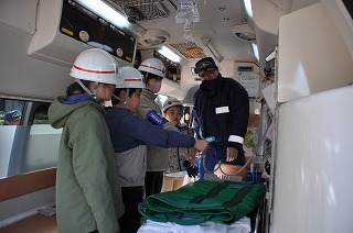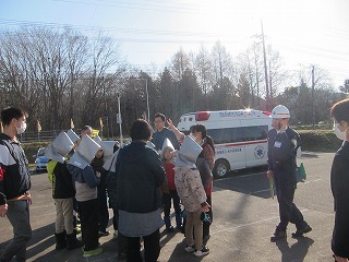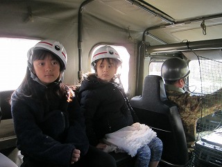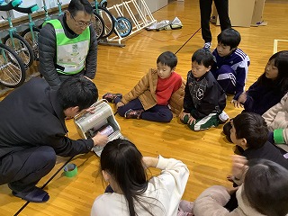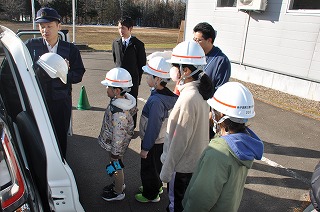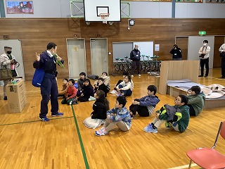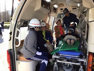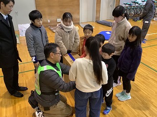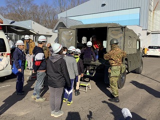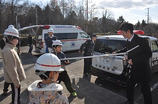 外に出てからは3つのグループに分かれて、パトカー、救急車、自衛隊車両の乗車体験をしました。警察の方からは刺股を使った防犯訓練もしていただきました。パトカーの助手席に座っのアナウンスや、救急車のベッドに横になる体験など、なかなかできない貴重な機会をいただきました。自衛隊車両の後部座席は思っていたよりも温かく眠くなってしまった子どもたちもいました。