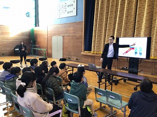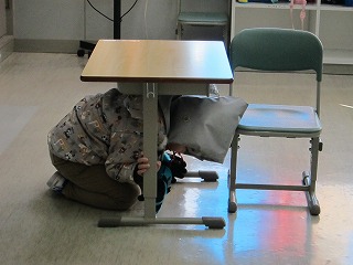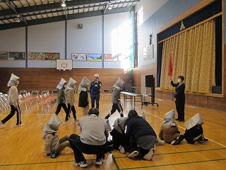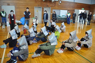 2時間目は避難訓練からスタート。授業中の教室で避難指示を受け、一度体育館へ移動。硫黄山の噴火の状況からすぐに外へ避難することになりました。子どもたちは静かに落ち着いて避難行動をとることができました。