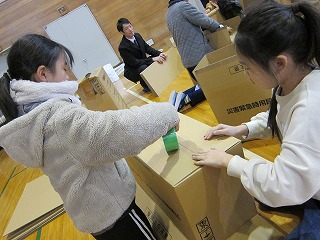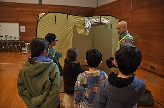 3時間目は弟子屈町防災士会と弟子屈町総務課防災情報係のみなさんのご指導の下、避難所を設営体験をさせていただきました。子どもたちは協力して段ボールベッドを組み立て、横になって寝心地を確かめたり、パーテーションの内側に入って模擬体験したり。色々工夫された新しいトイレについてのお話には、ちょっとびっくりしました。