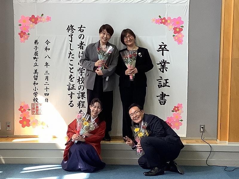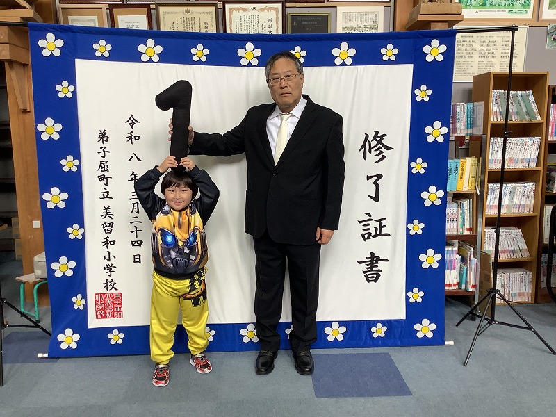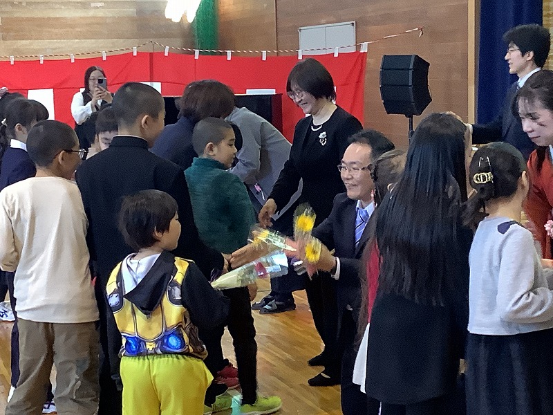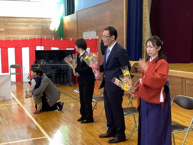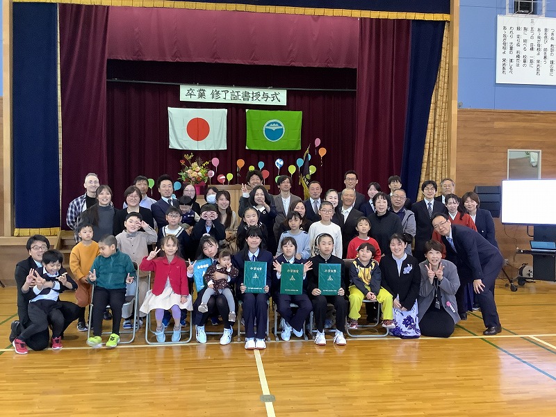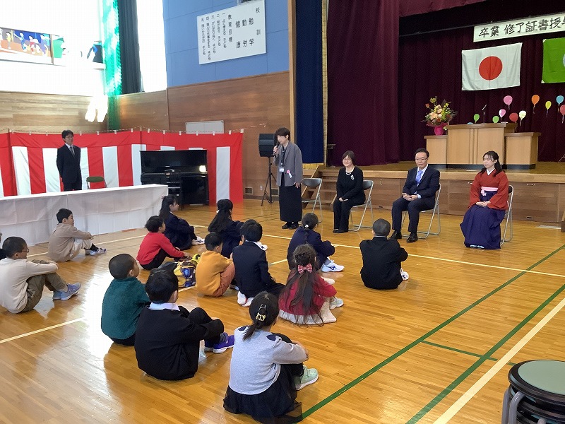 ご来賓、保護者、地域の皆さまが見守る中、1年生5名、2年生1名、3年生2名、4年生4名に修了証書が校長先生から授与されました。担任の先生から名前を呼ばれて「はい!」と会場に響き渡る声で返事をし、背筋をピンと伸ばしてキビキビした動きでステージに上がる姿に、この1年間の大きな成長を感じました。