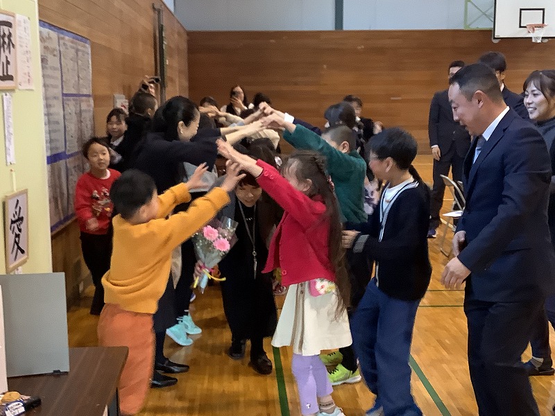 そして、引き続き卒業証書授与式。4名の卒業生は中学校の制服に身を包み、堂々と胸を張って卒業証書を受け取りました。ご来賓の方々の温かいメッセージに会場は涙……。6年生たちからの在校生へのメッセージ、それぞれの決意表明、そして家族、先生、地域の皆さまへの感謝の言葉は、さらに会場全体を感動と涙でいっぱいに溢れさせました。